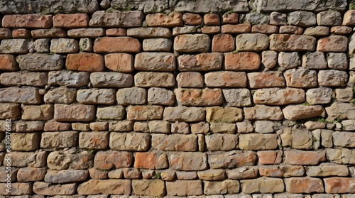 Ancient stone wall of an 18th century castle or fortress with weathered and cracked bricks in close up view.