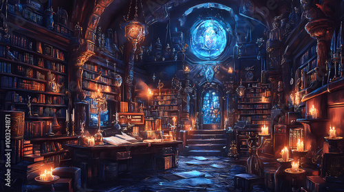Ancient tomes and mystical manuscripts hover mid-air, surrounded by candlelit shelves and mystical artifacts, in a quaint, dimly lit magical academy study chamber. Magic Academy. Illustration