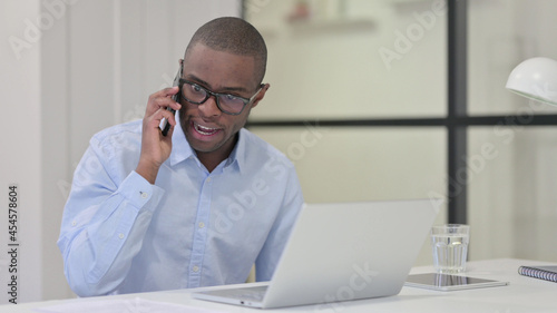 Angry African Man Talking on Phone at Work, Shouting