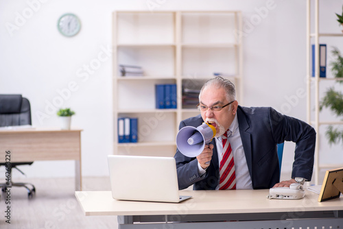 Angry boss holding megaphone at workplace