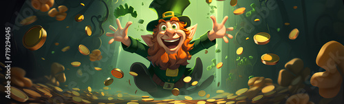 Animated Irish leprechaun, celebrating St. Patrick's Day. Gold coins, beer and shamrocks.