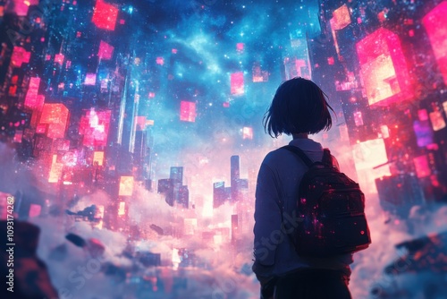 Anime girl looking at a city with a lot of lights