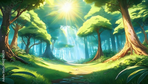 Animestyle Digital Painting Lush Green Forest Bathed in Sunlight, Majestic Trees Towering over a Vibrant Moody Landscape with Radiant Rays