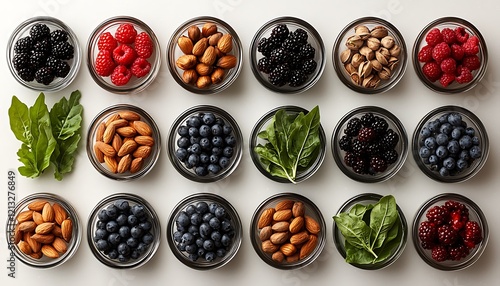Anti-aging food ingredients like nuts, berries, and dark leafy greens displayed on a light and minimalist background