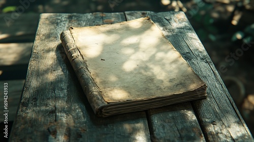 Antique book, wooden table, forest setting, sunlight, open pages