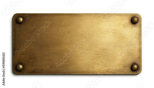 Antique brass rectangular plate, golden metal sign with four rivets. Textured gold surface with brushed finish. Vintage blank template for text graphics, classic design element, polished shiny