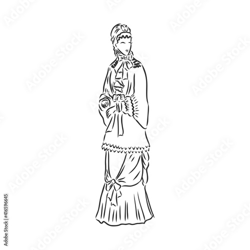 Antique dressed lady. Old fashion vector illustration. Victorian woman in historical dress. Vintage stylized drawing, retro woodcut style