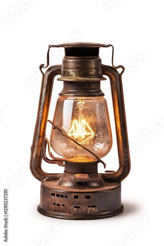 Antique kerosene lantern, lit, studio, background is plain white