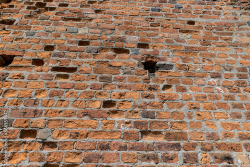 antique wall made of broken and cracked red bricks