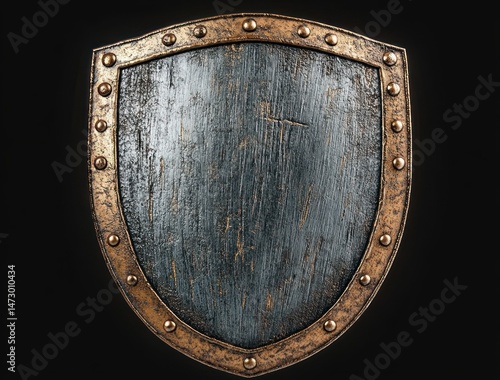 Antique wooden shield with a weathered metallic border and rivets set against a dark background, evoking strength and protection
