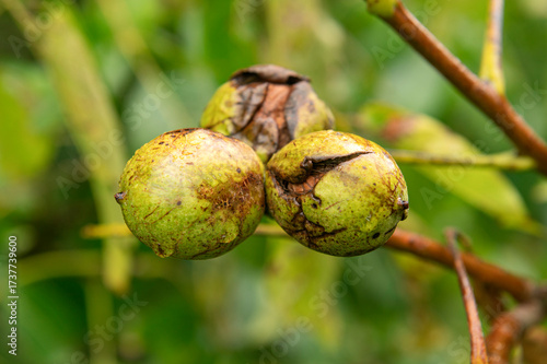 Appels Belgium September 2025 Walnuts (juglans) on a tree. Showing the fleshy husk around the nut. fruit, plant, tree, autumn, harvest, food,