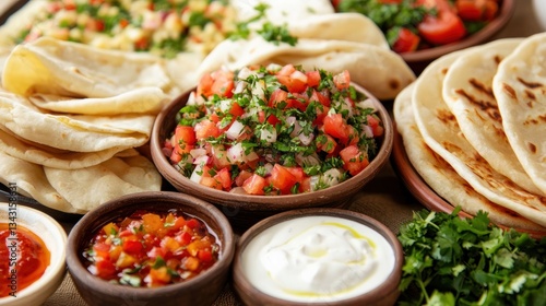 Appetizing Bowls of Pico de Gallo and Salsa with Fluffy Tortillas for a Gourmet Fiesta Overhead