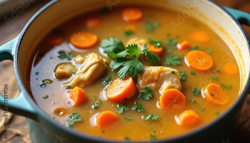 Appetizing chicken soup with carrots, parsley in pot. Homemade broth rich in vegetables. Healthy eating, balanced diet, warm food, delicious dinner. Culinary art, comfort food, classic meal for