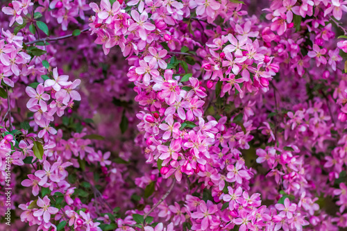 Apple tree in bloom, pink bright flowers. Spring flowering of the apple orchard. Floral background for presentations, posters, banners, and greeting cards.