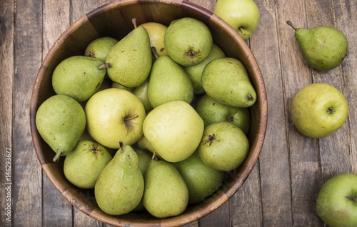 Apples and pears in wooden bowl
