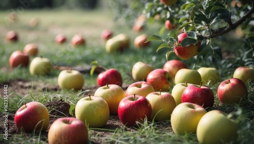 Apples fallen on the ground in an orchard with some still on the tree. Fruit harvesting and agriculture. Nature and farming. The scene of apple picking and nature's bounty