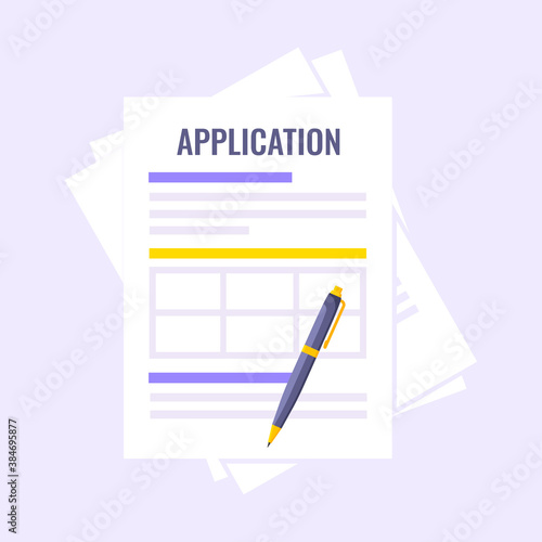 Application document form submit flat style design icon sign vector illustration isolated on light purple background. Complete application or survey document business concept with text contract stamp.