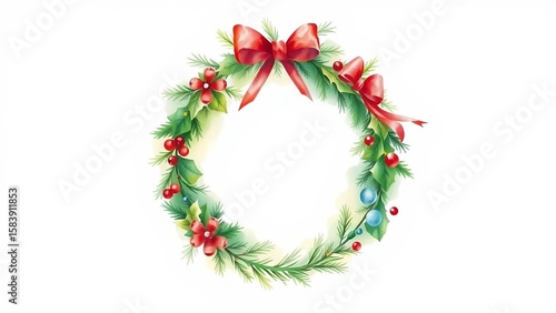 Aquarellillustration eines dekorativen Weihnachtskranzes mit roten Schleifen, Blättern und Beeren auf weißem Hintergrund.