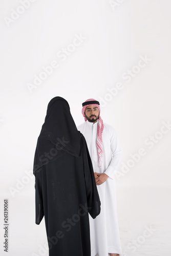 arab couple smiling and standing on white background
