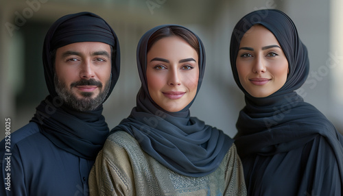 Arab man and woman in traditional attire pose for group portrait in Dubai studio, UAE.,generative ai