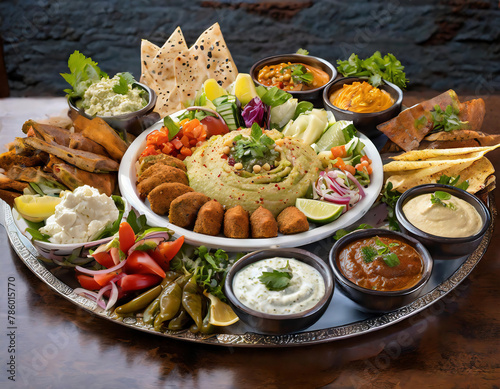 Arabian mezze platter with hummus, falafel, yogurt, salads, vegetables on patterned iron tray