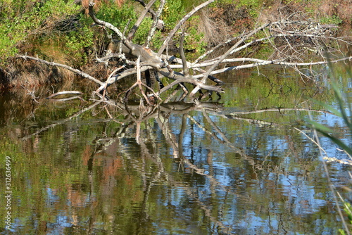 Arbre mort déraciné et reflets aqutiques.