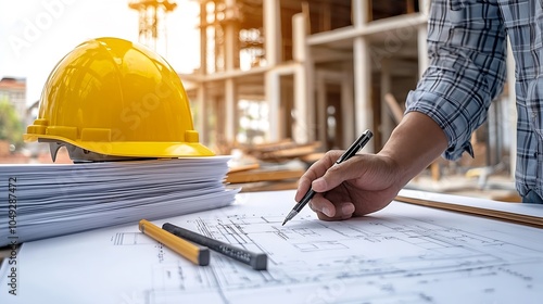 Architect with Plans and Hard Hat at Construction Site Under Development : Generative AI