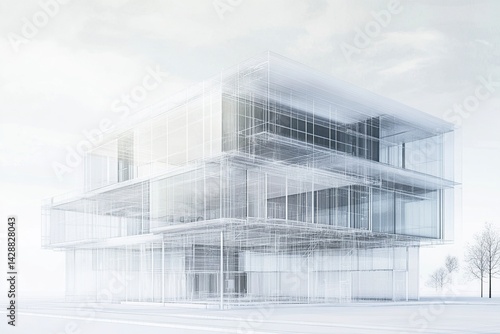 Architectural design, a modern building with transparent glass walls, a wireframe hologram, against a white background, an architectural drawing, architectural sketching, technical details, detailed