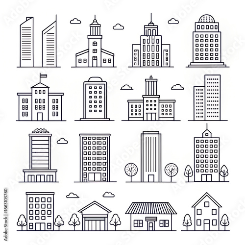 Architectural Line Art Collection – 16 Minimalist Building Illustrations in Grid Format