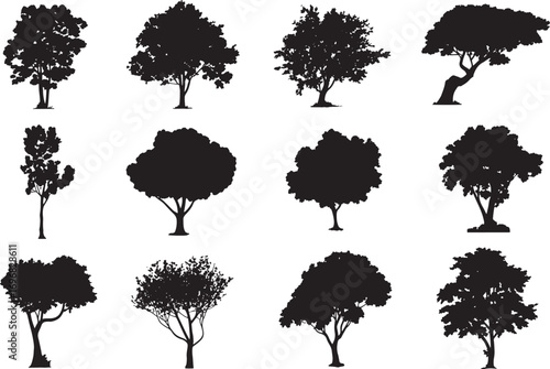 Architectural Tree Silhouette Vector Set – CAD Elevation Line Drawings of Oak, Maple, and Tropical Landscape Design