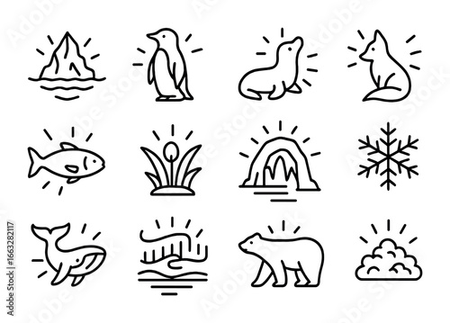 Arctic Bioluminescent Icons. Outline icon set of arctic bioluminescence: glowing iceberg, radiant penguin,