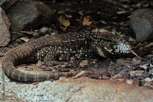 Argentine black and white tegu (Salvator merianae), adult, on ground, lambing, foraging, alert, South America, captive