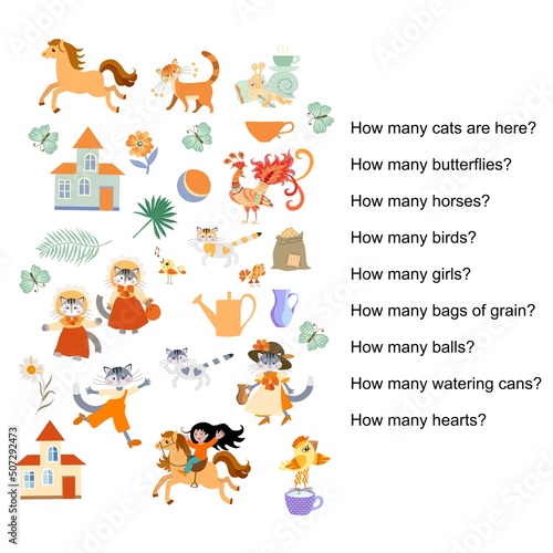 Arithmetic game for kids. Count the objects in the picture. Study sheet. Mindfulness training. Vector illustration.