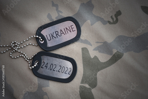 army blank, dog tag with text ukraine 24.02.2022 on the khaki texture background.concept of supporting ukraine
