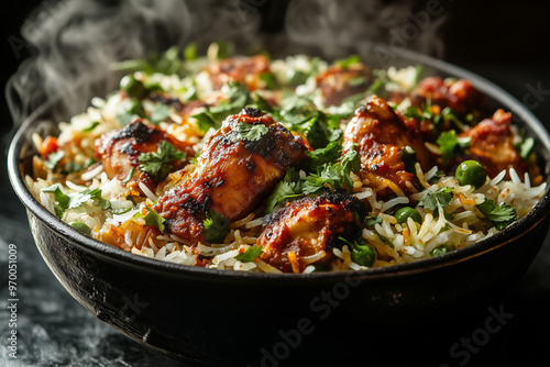 Aromatic and colorful spicy Indian chicken biryani served in a traditional bowl, perfect for a festive gathering or family dinner