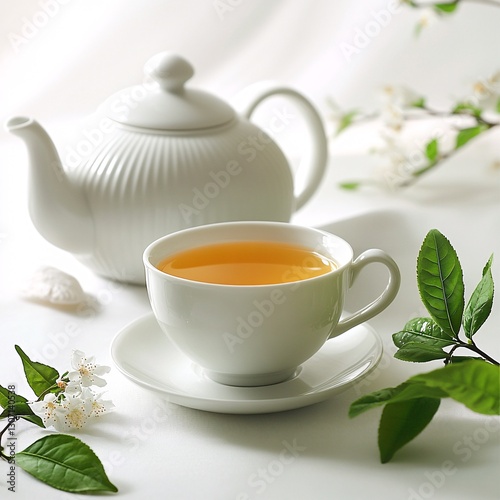 Aromatic Herbal Tea in White Cup and Teapot Fresh Leaves and Blossoms