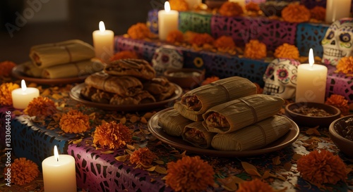 Arrangement of Traditional Food, Candles, and Decorative Items for Celebration