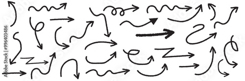 Arrow crayon brush doodle chalk line stroke. Sketch pencil texture line scribble arrow icon. Hand drawn grunge crayon brush sketch direction element on chalkboard. Vector illustration