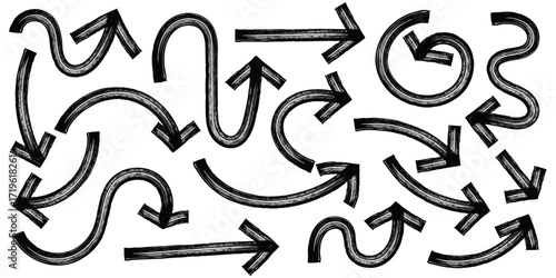 Arrows hand drawn with marker, chalk or charcoal. Black arrow shapes with brush strokes.