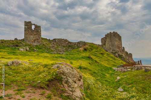 Arsenal ruins and flower meadow on top of Pergamon Acropolis (Bergama, Izmir province, Turkiye)