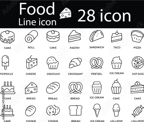 Art & IllustrationFood Black and Line Icons Set – Cake, Sandwich, Bakery, Fast Food, Dessert, Editable Stroke.