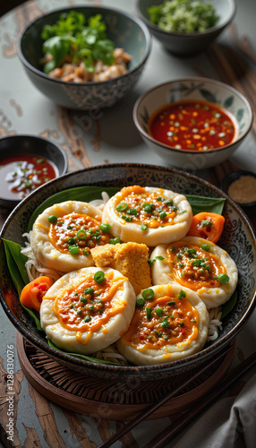 Artfully arranged Banh xeo with dipping sauces on rustic table, culinary delight