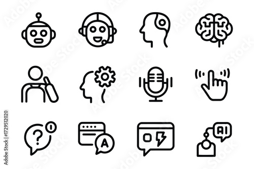 Artificial Intelligence and Machine Learning Vector Icon Set Depicting Chatbots and Human Brain Concepts