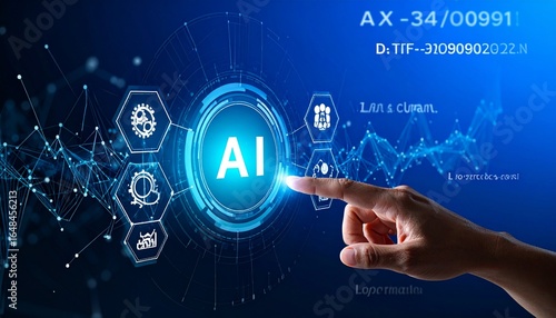 Artificial Intelligence Interface – Glowing AI Circle with Network Icons, Brain, Gear, and Human Interaction