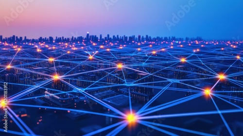 Artificial intelligence, SIEM concept, A vibrant cityscape at dusk, interconnected by glowing lines, symbolizing technology, connectivity, and data networks.