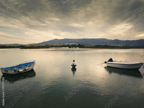 Artisan fisherman between fishing boats in the marshes of the river Palmones. Cadiz.