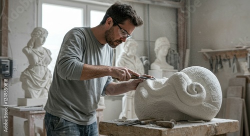 Artist meticulously sculpting a stone figure in a bright studio filled with classical statues
