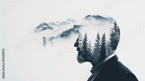 Artistic double exposure of a historian with a mountain forest landscape, featuring a digital interface and postcard design, merging past and future