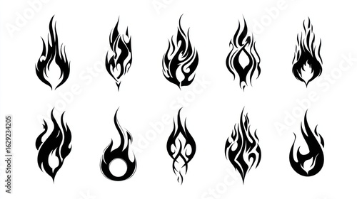 Artistic Fire Designs: A collection of dynamic and stylized fire illustrations, each showcasing unique flame shapes and contours in bold, striking black and white imagery.