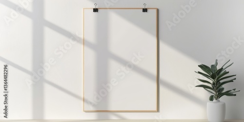 Artistic Mockup: A modern aesthetic comes to life with a blank picture frame hung against a pristine wall, illuminated by natural light, with a plant to give a sense of calmness.